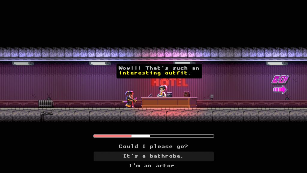 More interesting than the need to let dialogue play out before you respond is that how you respond can vastly change how a situation will go down. The most prominent example of this is during a dialogue scene early-on with a receptionist of a hotel. Button mashing will offer rude options that will leave the receptionist less than willing to help out in another part of the mission. Instead if you take the time and follow the dialogue she can become an important alibi as you try and exit the mission. I don’t want to spoil too much, but this scene worked well to show that this game is far more than just a hack-and-slash platformer.