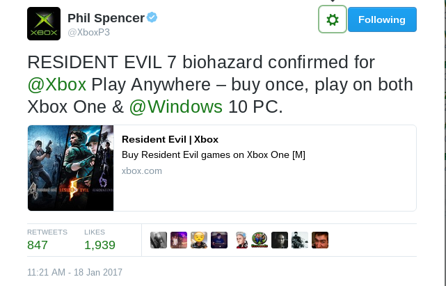 There was some pretty suprising news today regarding Resident Evil 7. In a tweet from Phil Spencer, Head of Xbox, it was announced that Resident Evil 7 will be a Xbox Play Anywhere title!