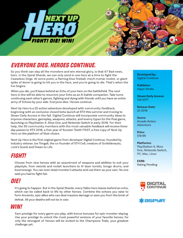 From the makers of Scribblenauts, Drawn to Life, and Lock’s Quest, we have a new game with a ton of potential that was just announced. BEHOLD… Next Up Hero! Next Up Hero is an arcade style beat-em-up where death is all part of the process. The game looks to involve a 3/4 top down view with twin stick shooter mechanics. You WILL die according to the devs, and it’s all part of the show. When you do die, you will leave behind an ‘Echo’ of your hero. Then your friend, or someone online it seems, can jump into your game and resurrect you as an AI battle companion to continue on the battle. Once that hero dies the cycle will go on and on until the boss has been destroyed. From the trailer below it looks like once you get enough AI Echos you can combine them into a more powerful Hero, called Ancients, to help you. On top of all of this each hero can have its on customization and power ups. Next Up Hero looks will be on our watch list, because damn does this look fun! This game has all of us here all hyped up and ready to get our hands on this game. It’s currently in closed BETA and looking to go in to Early Access later this year with a quarter one release date in 2018. Check out videos and all the other goodies below!