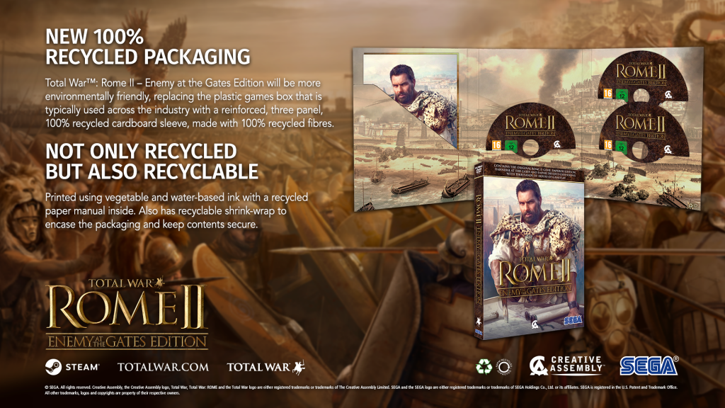 SEGA® Europe has today announced that it will switch to fully recyclable packaging for all its physical PC products, starting with the imminent release of Creative Assembly’s™ Total War™: ROME II – Enemy at the Gates Edition, on 6 February 2020. This edition will feature the Total War: ROME II along with the Hannibal at the Gates, Imperator Augustus, and Empire Divided DLCs. The news follows on from the successful collaboration between SEGA Europe and Sports Interactive™ in November 2019, which saw the physical release of Football Manager™ 2020, launched in 100% recyclable packaging.