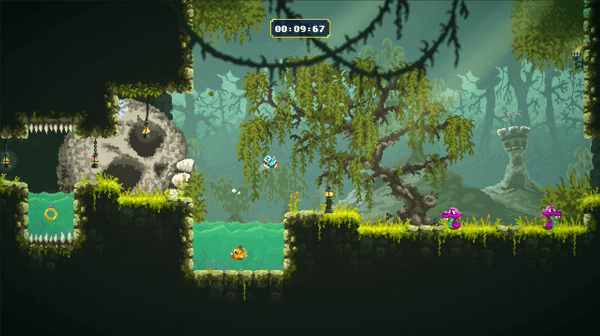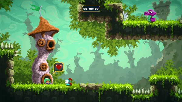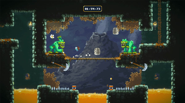 What does cut it above Super Meat Boy is that you do get a weapon. So not only are you just jumping and double-jumping your way to love, but you can also hack and slash through your enemies. The controls through everything, are very well done. They are tight and responsive and it’s really your fault if you fail and die and that’s bound to happen. I had a blast finding my first Golden Egg. I thought I missed the jump and failed but then I went into a secret area and ended up finding the first Golden Egg and the game just opened up at that point. I needed to jump and smack into walls, thinking where would I put a secret throughout every level. There are these secrets, treasures, and shortcuts littered around 40 different stages.
